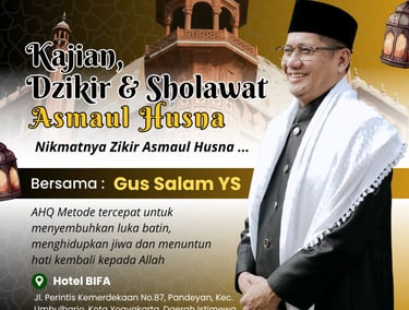 Menjawab kebutuhan itu, AHQ Center Indonesia menghadirkan lagi ruang penyembuhan spiritual melalui Kajian, Dzikir & Sholawat Asmaul Husna bersama pembimbing ruhani nasional, Gus Salam YS MPd, yang akan digelar pada Minggu (23 November 2025), di Hotel BIFA Yogyakarta, Jalan Perintis Kemerdekaan Yogyakarta.