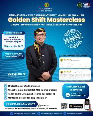 AHQNews — AHQ Center Indonesia membuka Golden Shift Masterclass (GSM) Batch #5, sebuah program intensif 30 hari yang dirancang untuk menghidupkan lagi kejernihan hati, menata ulang jiwa, dan membawa peserta semakin dekat kepada Allah melalui kekuatan Asmaul Husna.