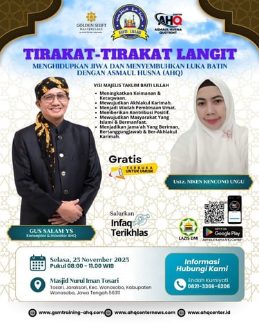 Program bergengsi ini dipandu langsung Gus Salam YS MPd, Konseptor dan Inovator AHQ (Asmaul Husna Quotient), yang telah dikenal luas melalui pendekatan spiritualnya yang lembut, terarah, dan sangat aplikatif untuk kehidupan sehari-hari.