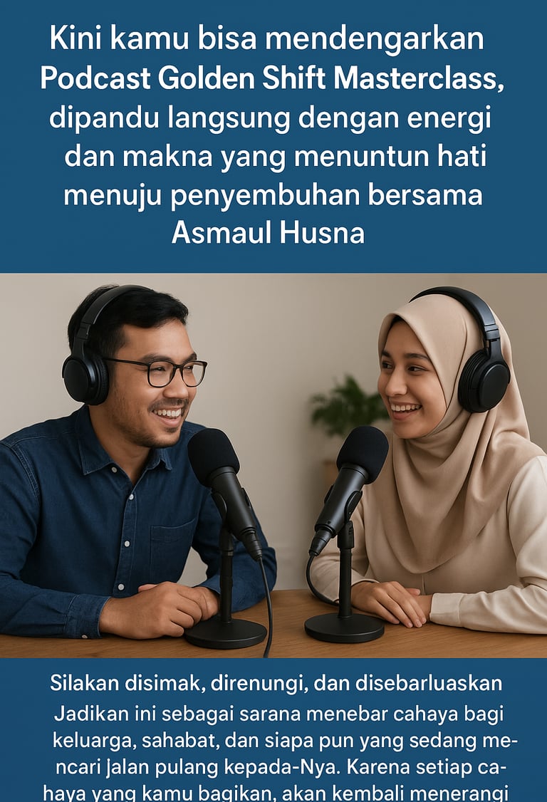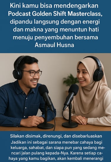 Podcast ini mengangkat tema ‘Menemukan Cahaya, Menyembuhkan Luka, dan Menghidupkan Jiwa bersama Asmaul Husna.’ Program ini menjadi jembatan bagi pendengar untuk merenungkan, mendengar, dan mengalami langsung energi spiritual dari setiap Asma Allah yang menghidupkan hati.