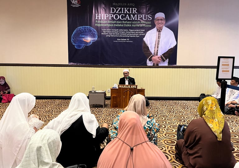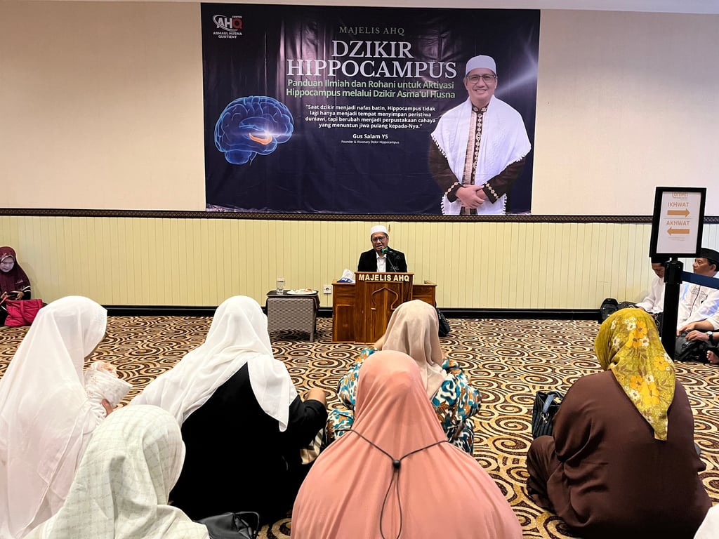 Dzikir Hippocampus I - Dibimbing langsung Gus Salam YS, untuk kali pertamanya, puluhan anggota Keluarga Besar AHQ ini diajarkan dzikir Asma Ar Rahman dan Al Quddus sebagai proses pembersihan otak kecil atau dalam istilah ilmiah disebut Hippocampus, dari memori-memori negatif yang tersimpan di dalamnya.