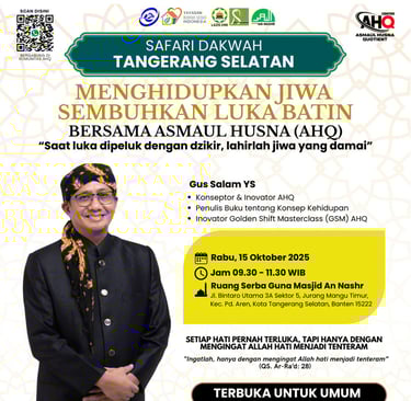 AHQNews, TANGERANG - Safari Syiar Asmaul Husna Quotient (AHQ) di Tangerang, Banten akan kembali hadir menyapa masyarakat Tangerang Selatan. Kali ini, kegiatan yang membawa tema ‘Menghidupkan Jiwa, Sembuhkan Luka Batin’ akan digelar di Ruang Serbaguna Masjid An Nashr, Bintaro Utama Sektor 5, Jurang Mangu Timur, Tangerang Selatan, Rabu (15/10/2025) mulai pukul 09.30 WIB – 11.30 WIB.