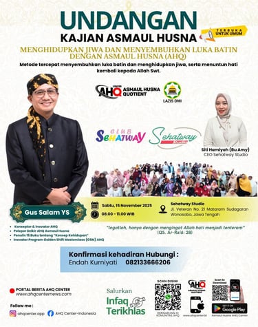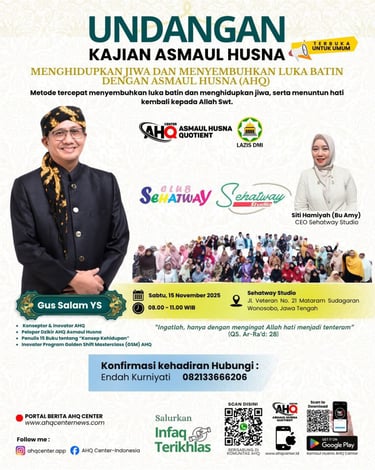 AHQNews - Cahaya dzikir dan kesejukan spiritual akan menyapa masyarakat Wonosobo dalam rangkaian Safari Dakwah Asmaul Husna Quotient (AHQ) bersama Gus Salam YS, MPd., Konseptor dan Inovator Metode Asmaul Husna Quotient. Acara ini akan digelar di Sehatway Studio, Jl. Veteran No. 21, Mataram Sudagaran, Wonosobo, Jawa Tengah pada Sabtu (15 November 2025 pukul 08.00–11.00 WIB).