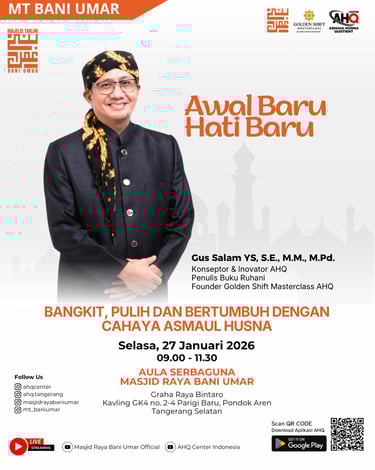 AHQNews - Majelis Taklim Bani Umar bekerja sama dengan AHQ Center Indonesia akan menghelat kajian ruhani bertajuk ‘Awal Baru, Hati Baru’, Selasa, 27 Januari 2026 besok. Kegiatan ini menghadirkan Gus Salam YS, SE MM MPd, Konseptor dan Inovator Asmaul Husna Quotient (AHQ), sebagai narasumber utama.