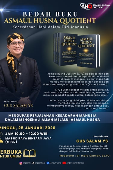 AHQNews - AHQ Center Indonesia akan menggelar kegiatan Bedah Buku Asmaul Husna Quotient (AHQ): Kecerdasan Ilahi dalam Diri Manusia pada Minggu, 25 Januari 2026, bertempat di Masjid Raya Bintaro Jaya (MRBJ). Acara ini dijadwalkan berlangsung pukul 10.00–12.00 WIB dan terbuka untuk umum.