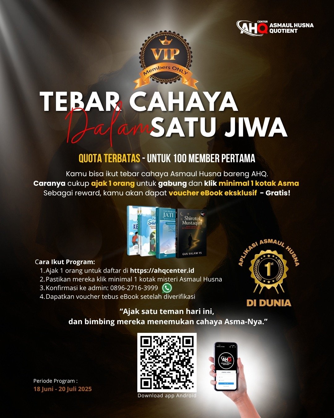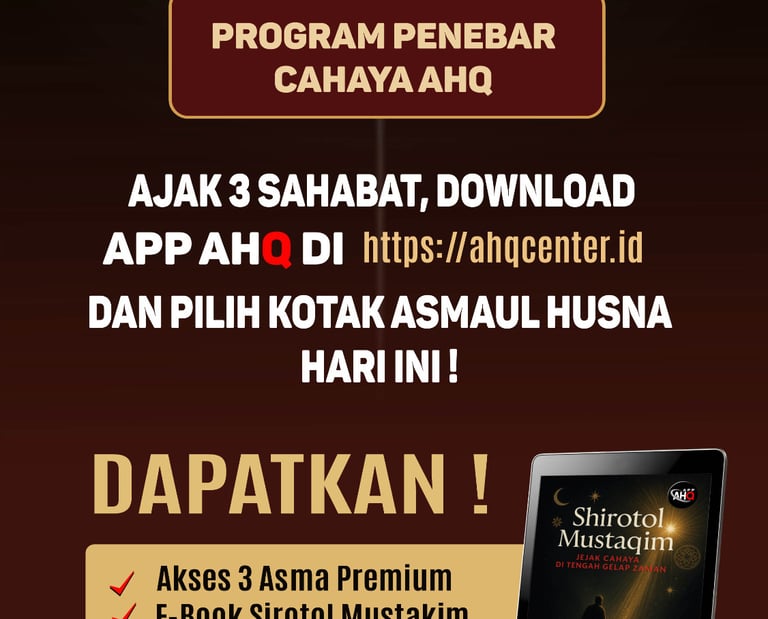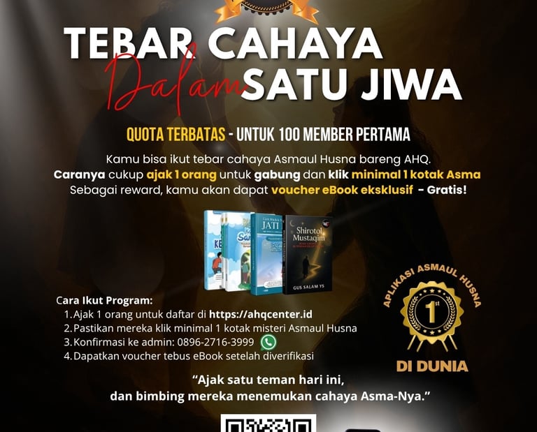 Kamu bisa ikut tebar cahaya Asmaul Husna bersama AHQ. Caranya cukup ajak 1 orang untuk gabung dan klik minimal 1 kotak Asma. Sebagai reward, kamu akan dapat voucher eBook eksklusif - Gratis!