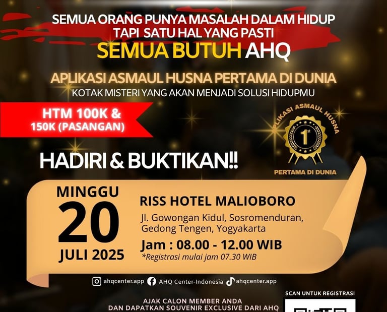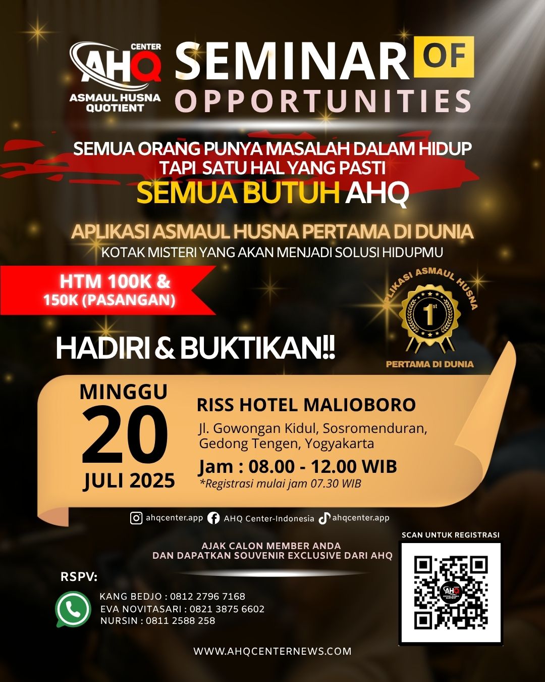 Ikuti Seminar AHQ | Minggu, 20 Juli 2025 di RISS Hotel Malioboro, Jalan Gowongan Kidul, Sosromenduran, Gedongtengen, Yogyakarta.