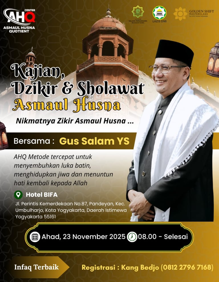 Menjawab kebutuhan itu, AHQ Center Indonesia menghadirkan lagi ruang penyembuhan spiritual melalui Kajian, Dzikir & Sholawat Asmaul Husna bersama pembimbing ruhani nasional, Gus Salam YS MPd, yang akan digelar pada Minggu (23 November 2025), di Hotel BIFA Yogyakarta, Jalan Perintis Kemerdekaan Yogyakarta.