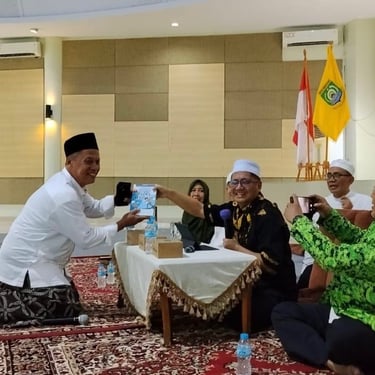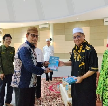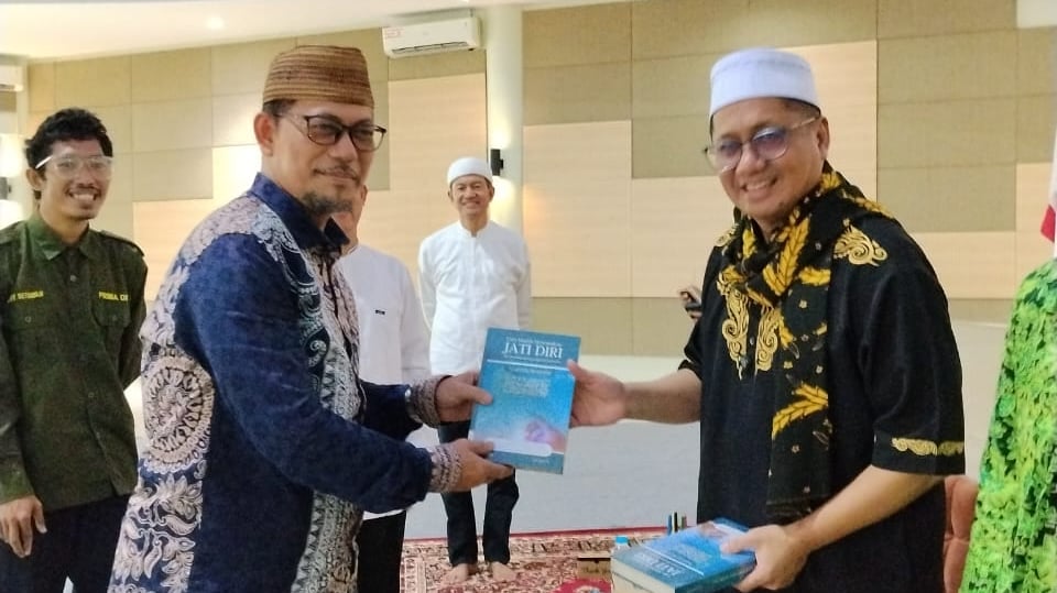 Gus Salam YS memberikan satu karya bukunya kepada Sekretaris Umum DMI Kota Tangerang, Dr Akhmad Suja’i MM, seusai kajian di Gedung MUI Kota Tangerang, Minggu (12/10/2025). Foto by AHQ Center Indonesia.