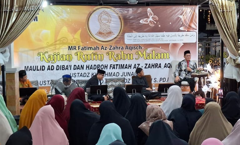 Acara diawali pembacaan Maulid Ad-Diba’i dan lantunan hadroh Fatimah Zahra yang menambah kekhidmatan suasana. Sejumlah ustaz turut serta dalam kajian ini, di antaranya KH Ahmad Junaidi, Ustaz Syahrowi SPdI, dan Ustaz Baihaqi SPdI.