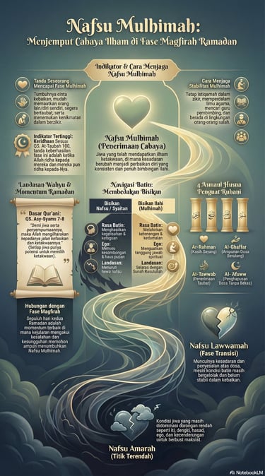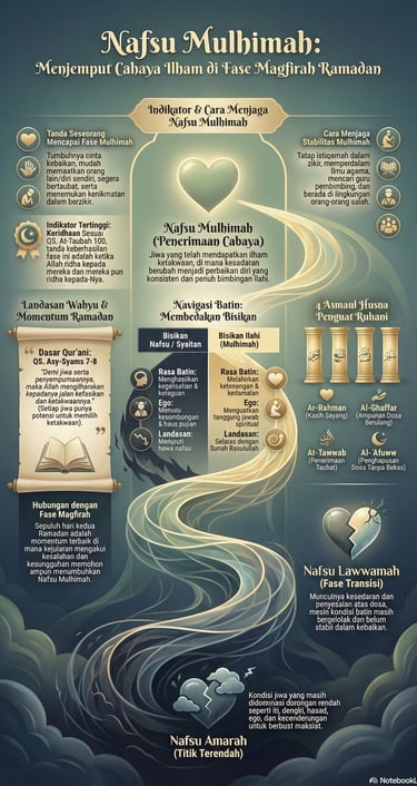 Sementara mulhimah adalah fase ketika jiwa mulai menerima ilham ketakwaan dan melakukan perbaikan diri secara konsisten.