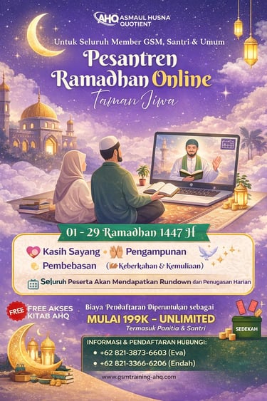 Menyambut Ramadan 1447 Hijriah, Asmaul Husna Quotient (AHQ) menghadirkan Pesantren Ramadan Online ‘Taman Jiwa’, sebuah program pendampingan ruhani intensif selama satu bulan penuh yang dirancang agar Ramadan benar-benar dihidupi, bukan sekadar dijalani. Program ini akan dibimbing langsung oleh Gus Salam YS, SE MM MPd bersama tim ustaz AHQ Center Indonesia.