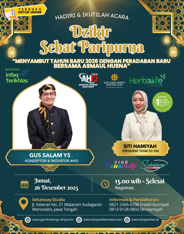 AHQNews - Menjelang pergantian tahun, masyarakat Jawa Tengah khususnya Wonosobo, kembali disapa sebuah gerakan spiritual besar yang digagas AHQ Center Indonesia. Melalui acara Dzikir Sehat Paripurna, umat diajak menyambut Tahun 2026 dengan hati yang lebih bersih, jiwa yang lebih kuat, dan tubuh yang lebih sehat melalui panduan dzikir Asmaul Husna.